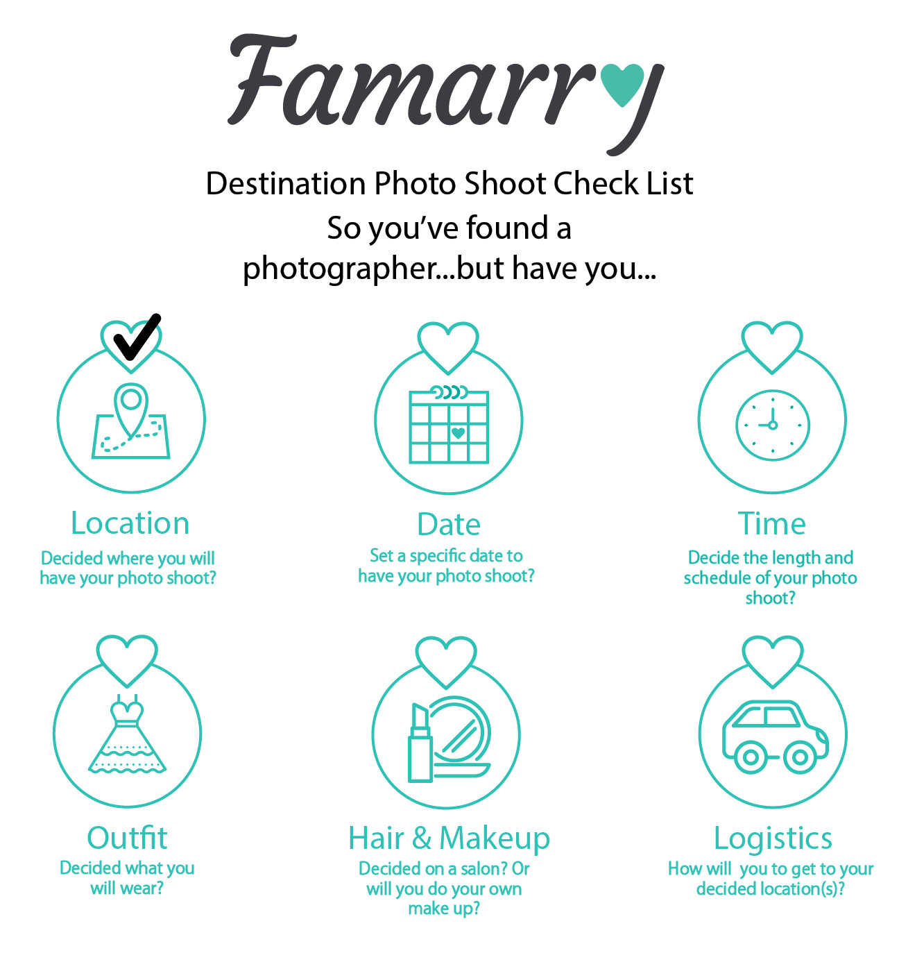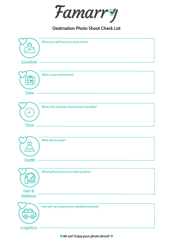As with anything wedding related, photo shoots take a lot of time to plan. So take it from our past couples and start early! From the photographer to the location and transportation, there are many elements to consider that need careful research and planning. See the bottom of this page for 2 free downloadable checklists that you can fill in to prepare for your photo shoot.